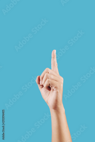 Hand of person pointing up in the air with index finger, isolated on light blue