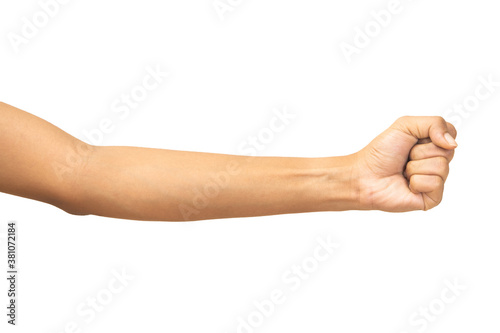 Hand of woman stranglehold, handful, studio light shooting isolated on white background