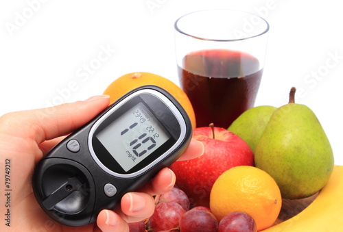 Hand of woman with glucometer and fresh fruits