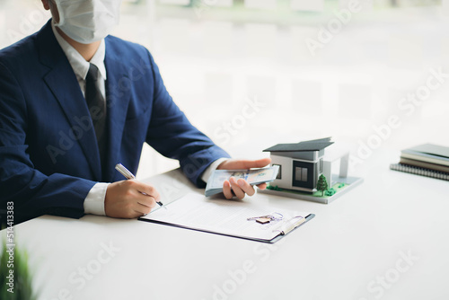 hand of young man customer signing contract for buying house with real estate broker in suit at estate agent office, investment, home loan contract, buying house, real estate and insurance concept