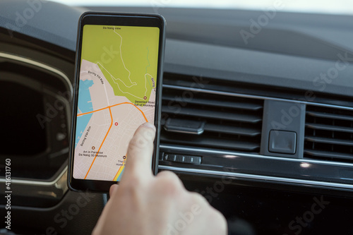 Hand of young man sitting in car and pointing at map on screen of smartphone