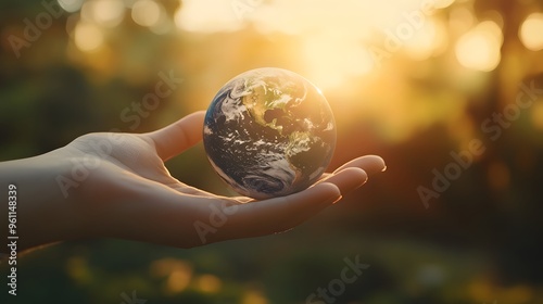 Hand Offering Earth as a Gift: A hand gently offering the Earth forward, as if presenting it as a precious gift, with a soft-focus background.