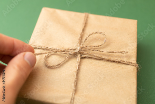 hand opening craft wrapped gift over green background
