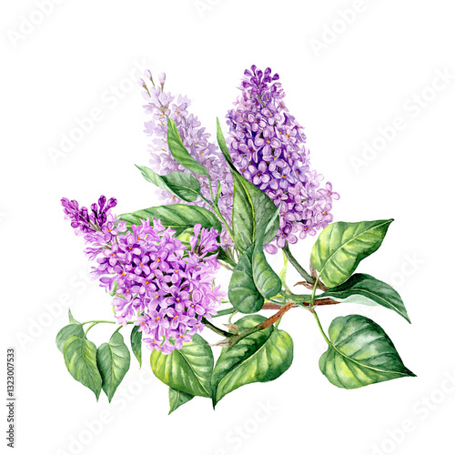 Hand painted lush Lilac branch with three iinflorescences