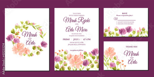 Hand painted of purple and peach floral watercolor wedding invitation