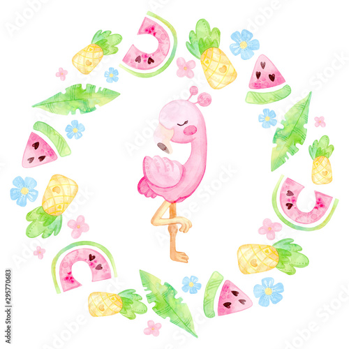 Hand painted watercolor. Cute cartoon illustration. Round wreath. Warm tropics. Flamingo, pineapple, watermelon, leaves, flowers. Isolated on white background