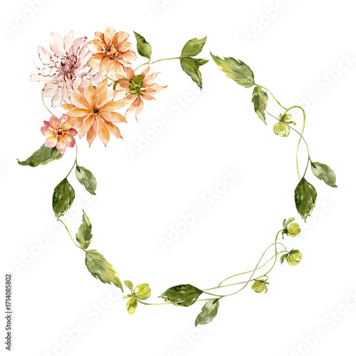 Hand Painted Watercolor Floral Wreath Illustration with Dahlias and Greenery, Delicate Botanical Frame