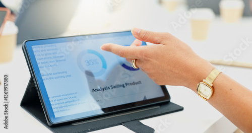 Hand, person and graph with tablet screen in office, analysis selling product and sales performance. Employee, explain report and meeting with online charts, review information and growth statistics