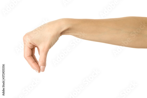 Hand picking, holding, grabbing or reaching. Woman hand gesturing isolated on white