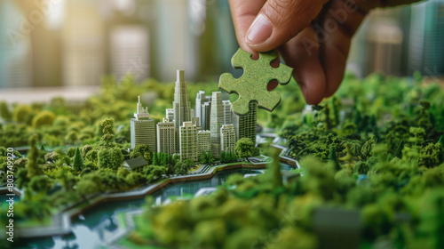 Hand placed a green puzzle piece on a city with skyscrapers and trees, in an eco friendly concept for environment protection or energy of sustainable development goal. The material is wood.