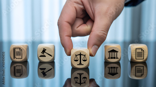 Hand places justice dice in row for legal balance and fair judicial system