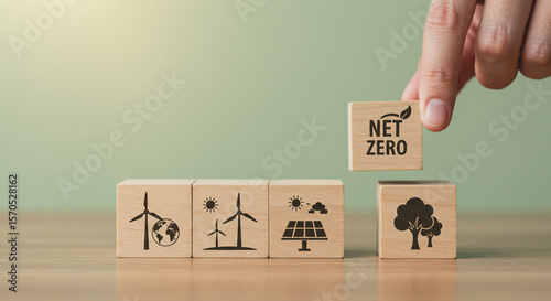 Hand places net zero cube alongside environmental symbols on wooden blocks