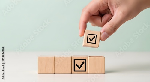 Hand placing a wooden block with a checkmark into a row of blocks, symbolizing completion and success