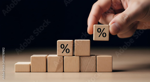 Hand placing percentage block on rising stair-like wooden cubes for financial growth concept