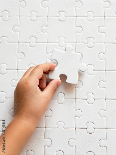 Hand Placing White Puzzle Piece on Blank Puzzle Background for Creative Concept