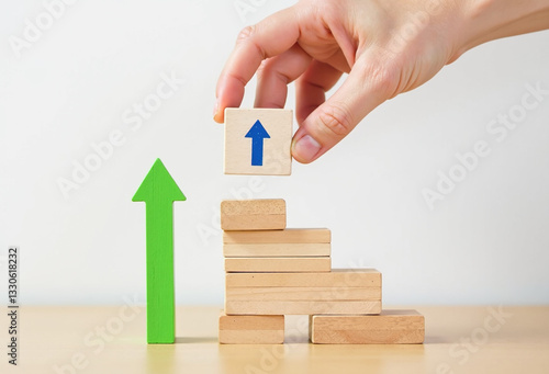 Hand placing wooden block with arrow on top of stair-like structure, symbolizing growth and progress.