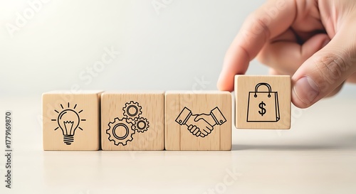 Hand placing wooden block with shopping bag icon, idea to partnership to sale