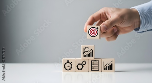 Hand placing wooden block with target icon on top of stack