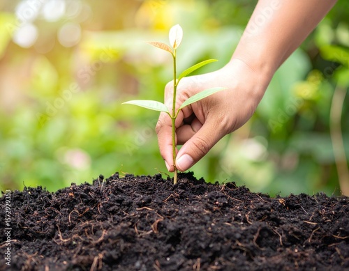Hand planting a small green seedling in fertile dark soil with a soft, sunlit bokeh background, symbolizing growth, new life, environmental care, and sustainable development for the future.
