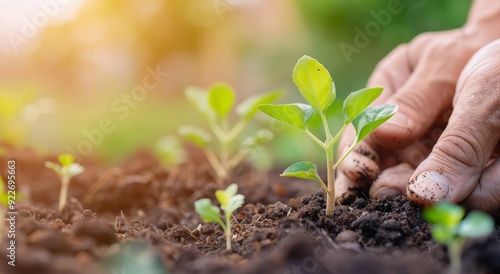 Hand Planting Seedling in Soil Under Warm Sunlight in a Garden