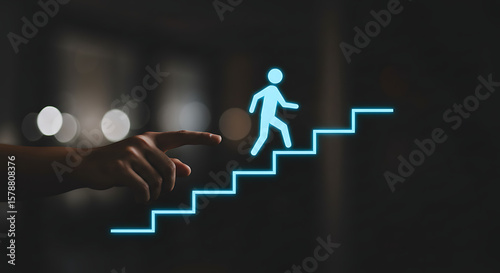 Hand pointig on hologram character climbs growth arrow chart, symbolizing steps of progress / success / achievement 7