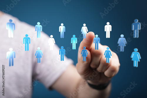 Hand pointing at person icons. Conceptual image representing recruitment, selection, and the decision-making process in business. Focus on peopl
