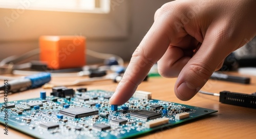 Hand points at PCB circuit board, microchips, on wooden desk under bright sunlight