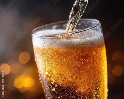 Hand pours beer into frosty pint glass with condensation and warm bar lighting