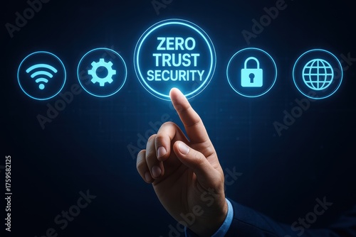 Hand Pressing Button for Zero Trust Security Concept with Icons of Network, Settings, Lock, and Internet