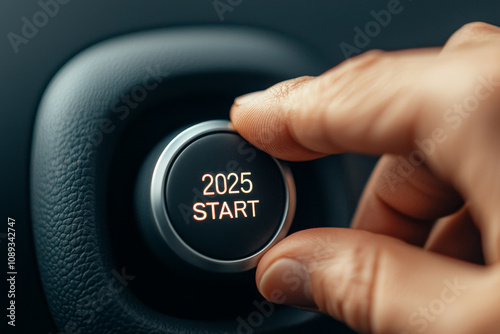Hand pressing futuristic 2025 start button in car, symbolizing innovation and technology. sleek design enhances modern driving experience