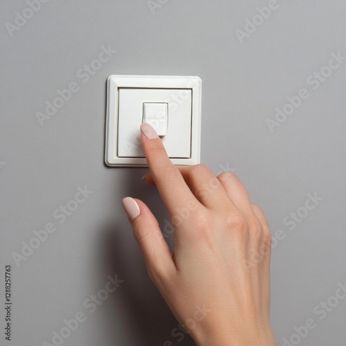 Hand pressing light switch on gray wall with neutral nail polish