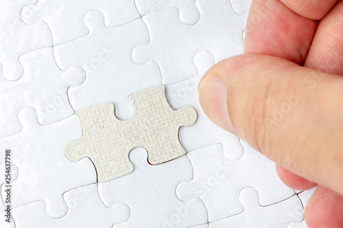Hand put the last piece of jigsaw puzzle to complete the mission