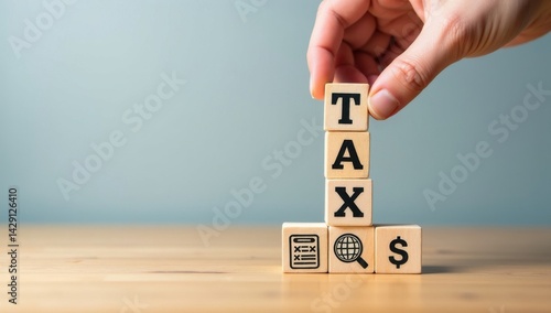 Hand putting tax icon in the wooden cube for income tax return and submit tax for payment tax documents online to the government