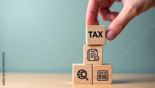 Hand putting tax icon in the wooden cube for income tax return and submit tax for payment tax documents online to the government