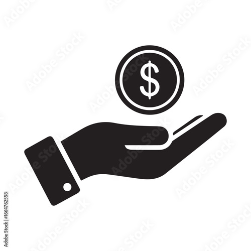 Hand Receiving Dollar Coin: Simple Black and White Icon, Financial Success Concept