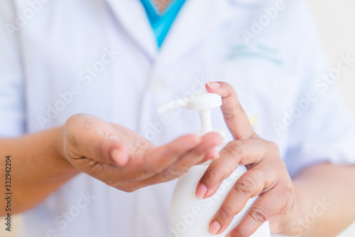 Hand sanitizer alcohol gel rub clean hands hygiene prevention of coronavirus virus outbreak.Doctor holding showing alcohol gel pump bottle, washing hands with alcohol gel or antibacterial sanitizer.