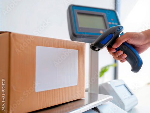 Hand scanning parcel with barcode scanner on shipping scale. Space for text.