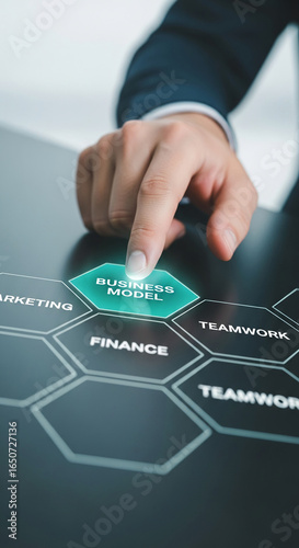 Hand selecting "Business Model" on a digital interface showcasing interconnected business concepts like finance and teamwork, representing strategic planning and execution in modern business