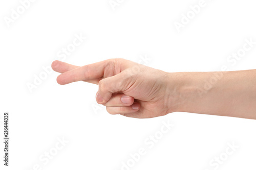Hand showing cheating sign, isolated on white background