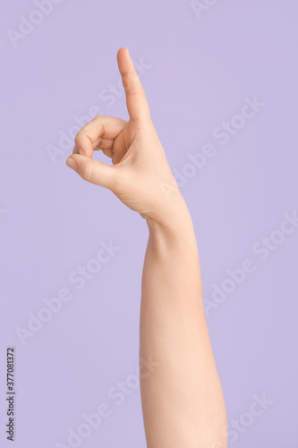 Hand showing letter D on color background. Sign language alphabet