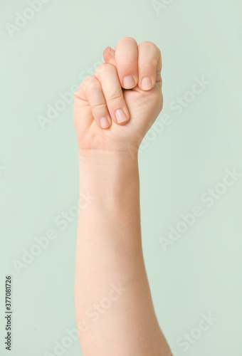 Hand showing letter N on color background. Sign language alphabet
