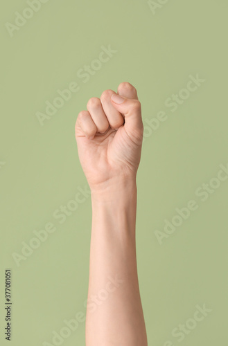 Hand showing letter S on color background. Sign language alphabet