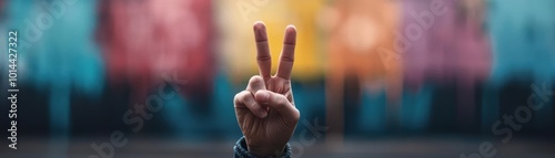 Hand showing peace sign against colorful graffiti background.