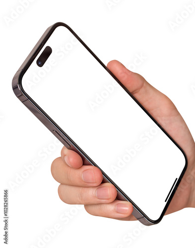 Hand showing smartphone with blank screen isolated on white background. Concept for business and financial, Technology, Product advertising, Marketing, Education and leaning, Travel, Social media.