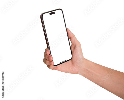 Hand showing smartphone with blank screen isolated on white background. Concepts for business finance, Concept technology, Concept product advertising and Concept marketing. Image high quality for you