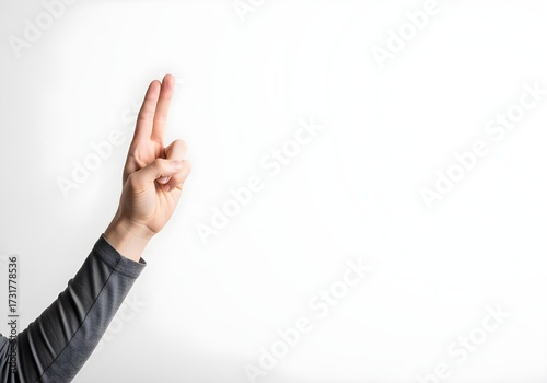 Hand showing two fingers in peace or victory gesture with raised arm against white background in studio lighting