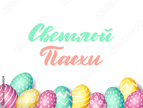 Hand sketched Russian inscription Happy Easter text, colorful eggs background. Easter sale special offer poster, online shopping banner template, holiday greeting card. Realistic Egg frame.