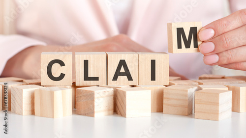 hand stacking wood cube block with claim word on wooden table. business startup and entrepreneur concept. marketing