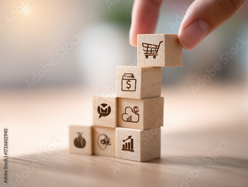 Hand stacking wooden block cubes with engraved business icons like growth charts, lightbulb, and globe, symbolizing strategic planning, step-by-step success, corporate development, and foundation buil