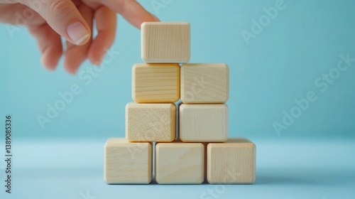 Hand stacking wooden blocks on pyramid structure against blue background